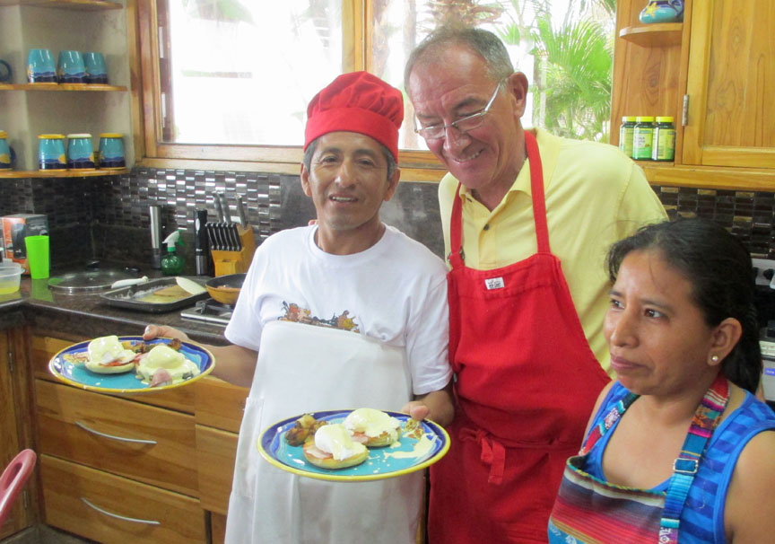 The morning following this cooking and eating extravaganza everybody slept in except Gertie and I. We were right there in the kitchen at 7:30 am to watch Chef Marc make Eggs Benedict and learn more hands-on tips.