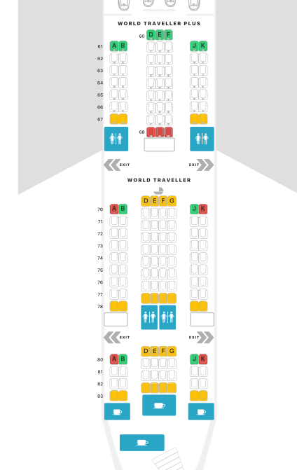 During the flight, because we were at the front, we enjoyed the legroom, being served first, and a tad more privacy. The lack of window didn’t bother us, and we were warm enough with a blanket. Below is the Seat guru.com seat map – we had seats J and K in row 70.