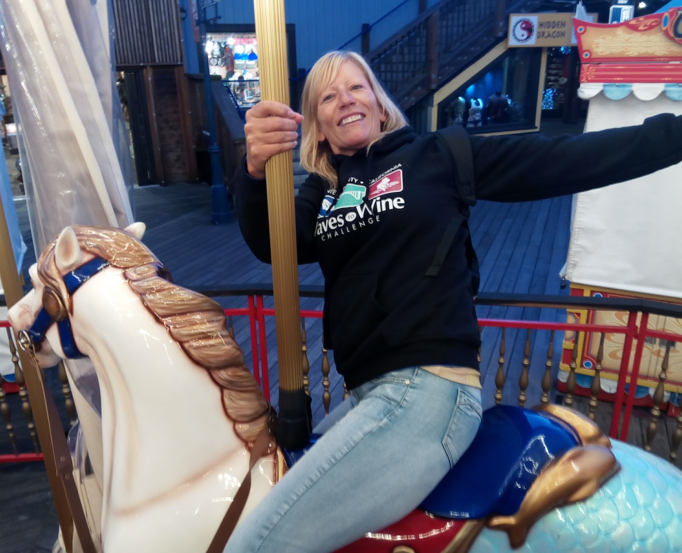 After the cruise, we strolled back along Pier 39 in the evening dusk, and came across an old brightly-lit carousel going around and around, with just one lady on board having a lot of fun.