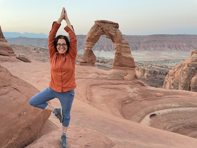 A sunrise hike up to Delicate Arch at Arches National Park is worth waking up for at 3 am. Watch the sun go from cotton candy pink to a golden yellow as the sun casts its light on the arch, showing sandstone, faded red, and charcoal colors.